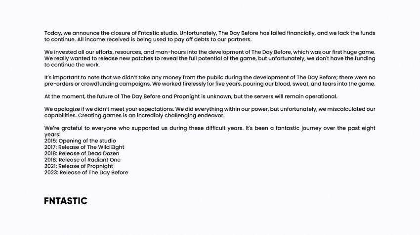 Как сообщила Fntastic, релиз The Day Before в раннем доступе обернулся финансовым провалом, а денег на продолжение операций у студии не осталось. Вырученные деньги пойдут на погашение долгов перед партнёрами.