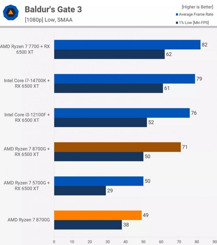 Ресурс TechSpot протестировал только старший Ryzen 7 8700G и полученные результаты в целом совпадают с результатами Computer Base. Например, в F1 2023 от чипа получилось добиться 125 FPS, что в 2,2 раза больше по сравнению с Ryzen 7 5700G. А в Spider-Man Remastered новинка выдала 68 FPS. Также здесь встроенную графику Ryzen 7 8700G сравнили со связками из разных процессоров и Radeon RX 6500 XT. Вполне ожидаемо, новинка оказалась слабее в большинстве случаев, превзойдя лишь Ryzen 7 5700G и Radeon RX 6500 XT.