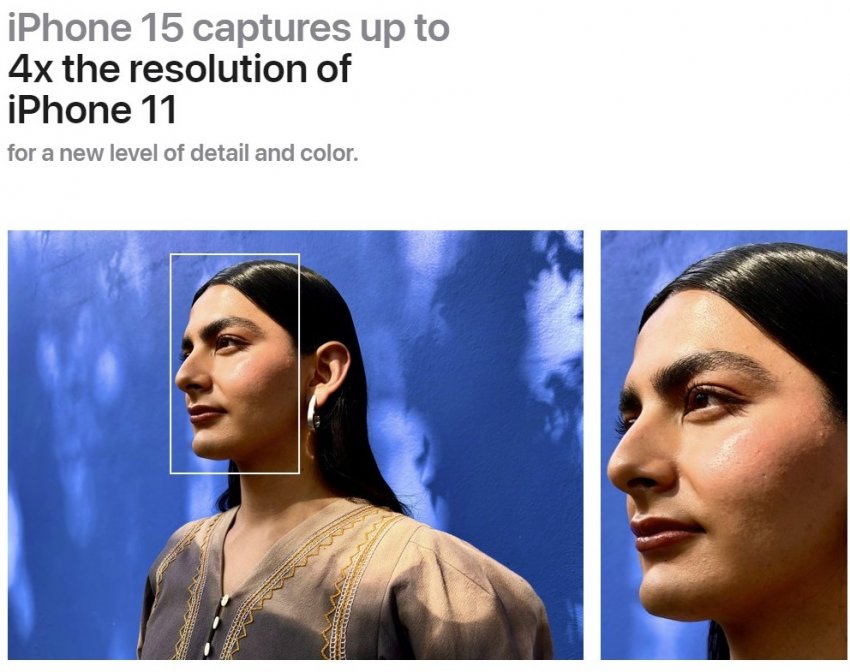 В каждом блоке сравнения приводятся преимущества, которые получит покупатель новых устройств. Например, в сравнении с iPhone 11 новый iPhone 15 предлагает в четыре раза лучшее разрешение фотографий, больше памяти, поддержку режимов Action и Cinematic для записи видео, предлагает на 60 % более производительный GPU, поддержку 5G и многое другое. Также к преимуществам iPhone 15 компания Apple отнесла универсальный разъём USB-C.
