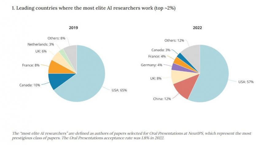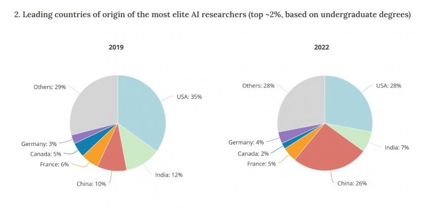 США по-прежнему удерживают пальму первенства в разработке ИИ, однако всё больше разработок в этой сфере предлагают исследователи, получившие образование в Китае. Китайские учёные составляют 38 % ведущих исследователей искусственного интеллекта в США, американские — 37 %. Тремя годами ранее эти цифры были другими — 27 и 31 % соответственно.