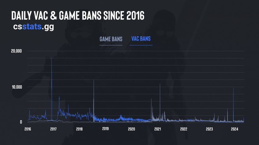 Агрегатор CS Stats тем временем доложил, что прошедшие выходные (конкретно 27 апреля) оказались на втором месте по количеству блокировок VAC в Counter-Strike 2 (CS:GO) за день с 2019 года.
