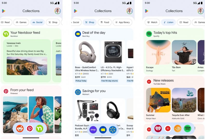 Затем Брайт перешёл к некоторым более крупным новшествам. Первым из них стал новый раздел магазина приложений под названием «Коллекции». «Коллекции» предназначены для отображения контента из уже приобретённых приложений и систематизируют всё по категориям, таким как «Покупать», «Смотреть» и «Слушать». Появилась опция «Продолжить просмотр» для различных потоковых приложений, а также последние предложения от избранных розничных продавцов. «Когда контент вашего приложения находится в одном месте, вам легче продолжить с того места, на котором вы остановились», — говорится в блоге Google.