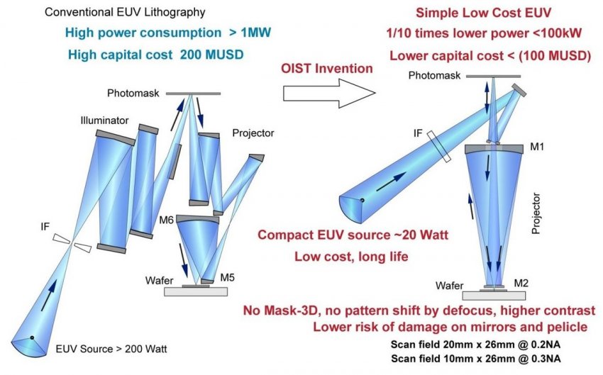 Профессор Цумору Шинтаке (Tsumoru Shintake) из Окинавского института науки и технологий (OIST) разработал существенно упрощённый инструмент для EUV-литографии, который значительно дешевле сканеров производства ASML. Предложенная им литографическая система использует два зеркала вместо шести. Если устройство поступит в массовое производство, оно может изменить отрасль оборудования для производства чипов, если не всю полупроводниковую промышленность.
