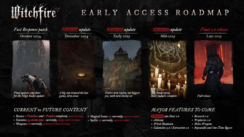 Ранний доступ Witchfire стартовал прошлой осенью в EGS, 23 сентября 2024 года игра добралась до Steam, а релиз версии 1.0 планируется в конце 2025-го. План развития проекта представлен на изображении ниже.