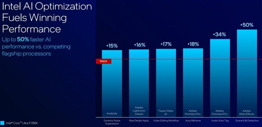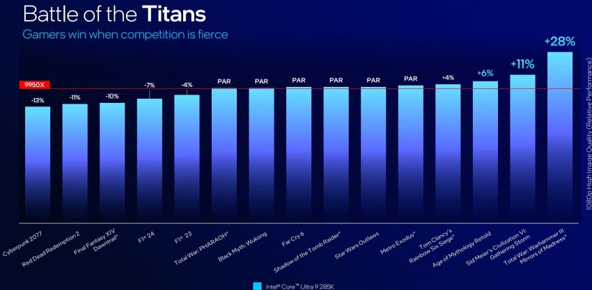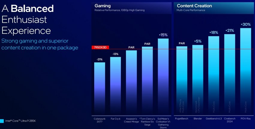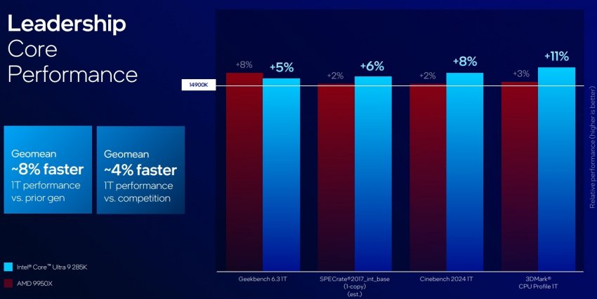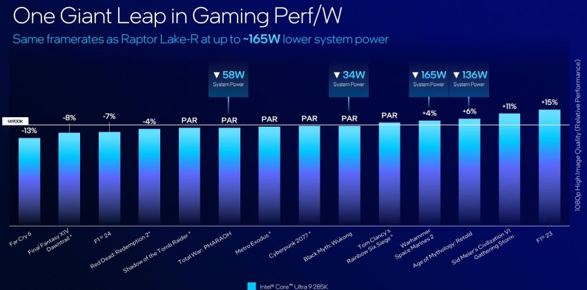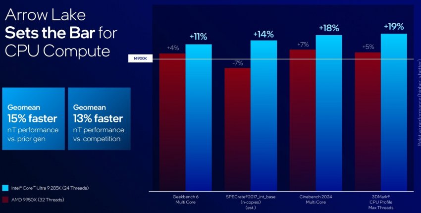 Что касается производительности новых чипов в играх, то всё было сказано ещё вчера, в рамках крупной утечки. Тот же флагман Core Ultra 9 285K медленнее Core i9-14900K и AMD Ryzen 9950X — плата за сниженное энергопотребление. Графики ниже говорят всё за себя. Однако, зная Intel и её стремление сгладить углы в рамках внутренних тестов, реальную картину производительности новых процессоров в играх покажут только независимые тесты.