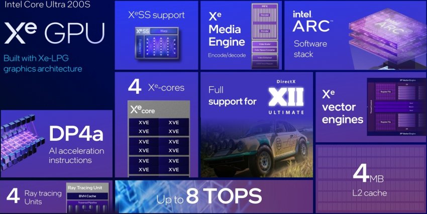 Intel Arrow Lake-S — первые настольные процессоры, оснащённые графическими ядрами Intel Xe на архитектуре Xe-LPG. «Встройка» поддерживает программное обеспечение и драйверы для видеокарт серии Arc. Кроме того, для неё заявляется поддержка пакета API DirectX 12 Ultimate, однако от новой графики в составе Core Ultra 200S не стоит ожидать чуда. В играх её производительность будет посредственной. В то же время «встройка» имеет медиадвижок Xe, поэтому она поддерживает все те же возможности кодирования, что и Alchemist (кодирование AV1/AVC/HEVC и т.д.). Также встроенная графика новых процессоров поддерживает инструкции DP4a, что обеспечивает ей поддержку технологии масштабирования Intel XeSS.