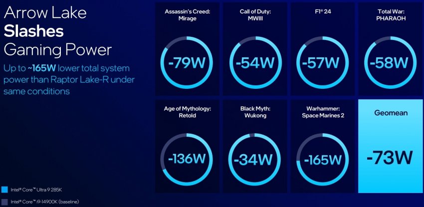 Как уже говорилось выше, в новых настольных процессорах Arrow Lake-S компания Intel делает акцент на энергоэффективность. Например, флагманский Core Ultra 9 285K потребляет до 58 % меньше мощности в продуктивных задачах по сравнению с процессорами Raptor Lake Refresh, о чём говорят данные четырёх внутренних тестов компании.