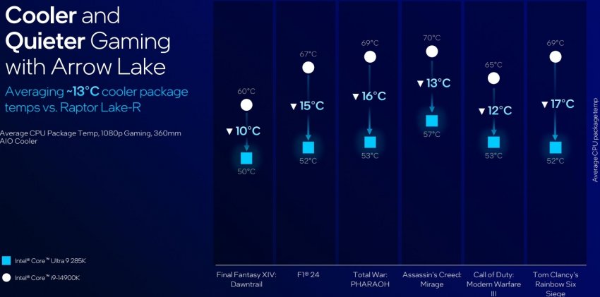 В играх новый процессор потребляет на 73 Вт меньше по сравнению с Core i9-14900K (при использовании базового профиля настроек). Чем меньше энергопотребление, тем ниже рабочая температура. Intel заявляет, что чипы Core Ultra 200S работают при температурах на 13 градусов Цельсия ниже, чем предшественники, при использовании систем СЖО типоразмера 360 мм.