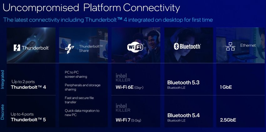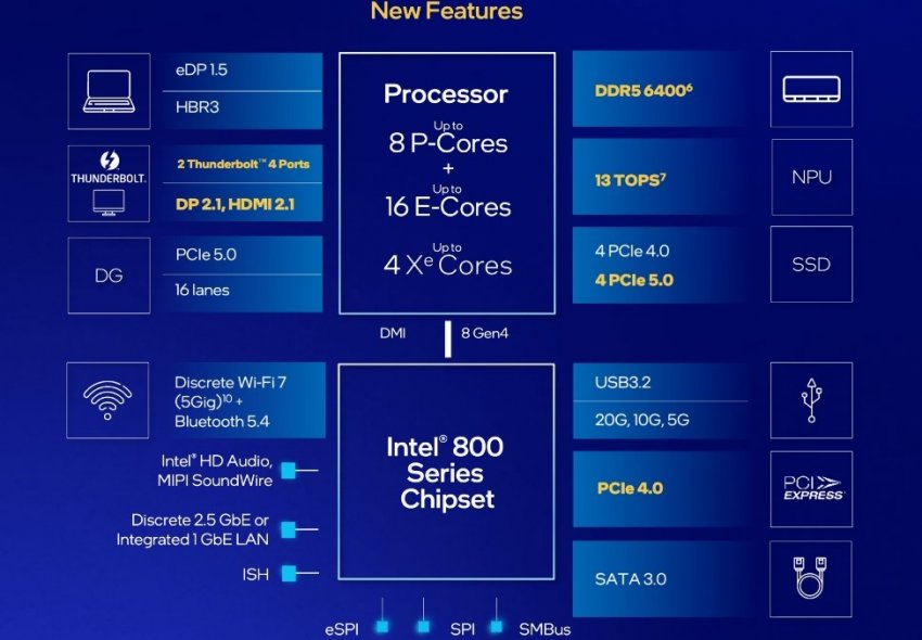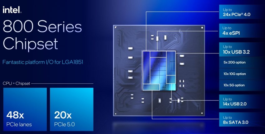 Пожалуй, самой важной особенностью новой платформы LGA 1851 является поддержка 20 линий PCIe 5.0 вместо 16 у предшественников. Это означает, что видеокарты нового поколения с поддержкой PCIe 5.0 не будут ограничены восемью линиями при одновременном использовании в ПК NVMe-накопителей стандарта PCIe 5.0. В целом новая платформа поддерживает 48 линий PCIe (20 линий PCIe 5.0 и 24 линии PCIe 4.0 через чипсет, ещё четыре линии PCIe 4.0 через CPU), до 10 портов USB 3.2, до 14 портов USB 2.0 и до восьми SATA III. Новинки также поддерживают до двух портов Thunderbolt 4, Wi-Fi 6E и Bluetooth 5.3