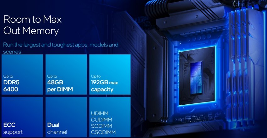 Двухканальный контроллер памяти поддерживает модули DDR5-6400 объёмом до 48 Гбайт, то есть в сумме систему можно оснастить до 192 Гбайт ОЗУ. Поддерживаются модули UDIMM, CUDIMM, SODIMM и CSODIMM, а также отмечается поддержка ECC.