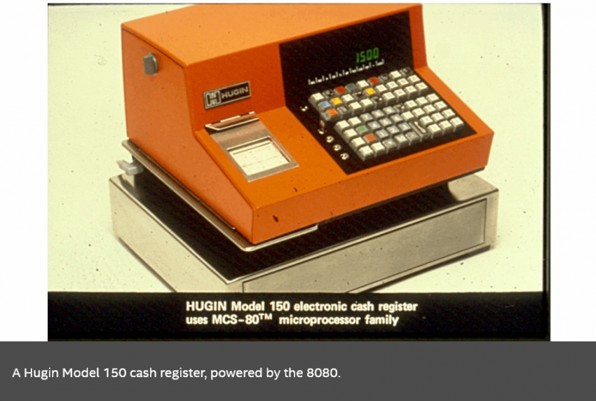 Кассовые аппараты Hugin Model 150 от шведской компании Hugin были одними из первых электронных кассовых аппаратов с процессорами Intel 8080. Несмотря на значительные улучшения по сравнению с механическими кассовыми аппаратами, ранние электронные устройства имели ограниченную функциональность и работали на фирменном программном обеспечении. С появлением 8080 кассовые аппараты приобрели функциональность, подобную компьютерной. Со временем они стали сложнее, получили цифровые дисплеи, возможность печатать чеки и считывать кредитные карты. Сегодня процессоры Intel Core i3 используются во многих кассах самообслуживания и POS-терминалах.