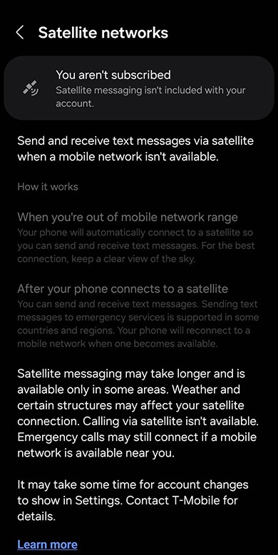 Чтобы получить доступ к функции спутниковых сообщений пользователи должны подать заявку на участие в бета-тестировании сервиса T-Mobile Starlink. Новый сервис позволит отправлять и получать текстовые сообщения даже в условиях отсутствия сотовой сети. В настройках смартфона указано, что на качество приёма сигнала может повлиять погода (например, облачность) и находящаяся поблизости инфраструктура. Также в меню разъясняется, что для отправки и получения текстовых сообщений через спутниковую систему может потребоваться больше времени, чем обычно.
