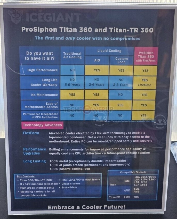 На выставке были представлены две модели СЖО TITAN с пожизненной гарантией на саму систему и 6-летней гарантией на комплектные вентиляторы. Производитель утверждает, что система прослужит дольше вентилятора, поскольку в её конструкции отсутствует помпа, подверженная износу и структурной деградации.