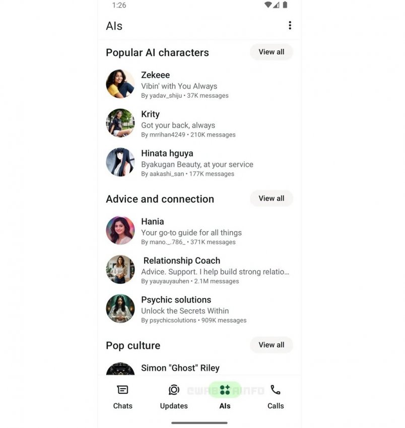 Мессенджер WhatsApp в свежей бета-версии тестирует новый дизайн приложения для Android, который заменяет вкладку «Сообщества» на главном экране на специальный раздел для чат-ботов ИИ. Он включает в себя выбор из «Популярных персонажей ИИ» для общения и прочие тематические опции. Другие функции на основе ИИ в WhatsApp включают изображения и стикеры, созданные ИИ, а также инструмент поиска с использованием Meta#mark-extr AI.