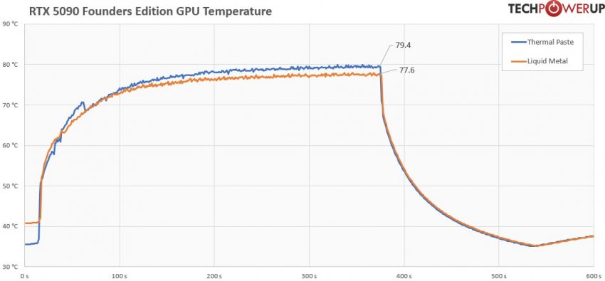 Во флагманской видеокарте GeForce RTX 5090 Founders Edition компания Nvidia использует термоинтерфейс типа «жидкий металл» для лучшей теплопроводности между графическим процессором и пластиной испарительной камеры новой системы охлаждения Double Flow Through. Как показал эксперимент TechPowerUp, замена жидкого металла на обычную термопасту на деле незначительно снижает эффективность охлаждения GPU.