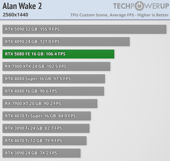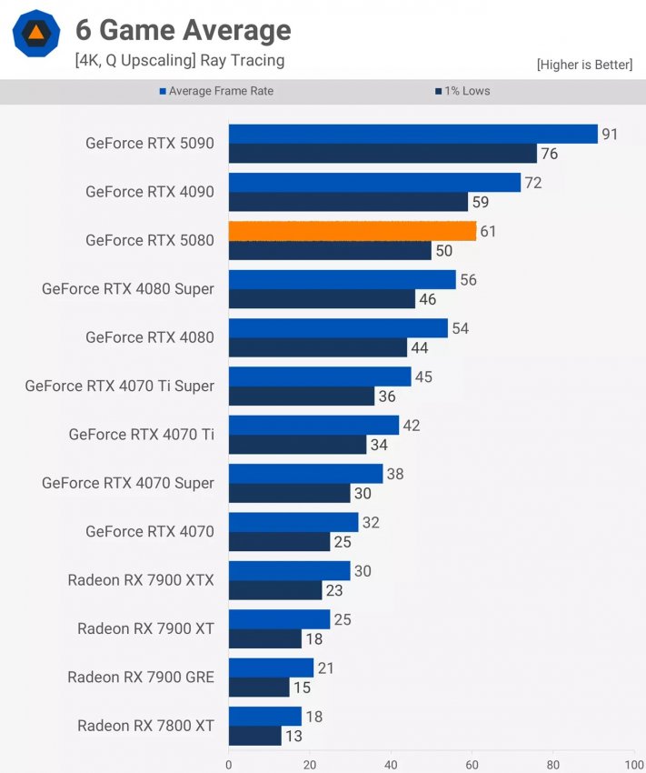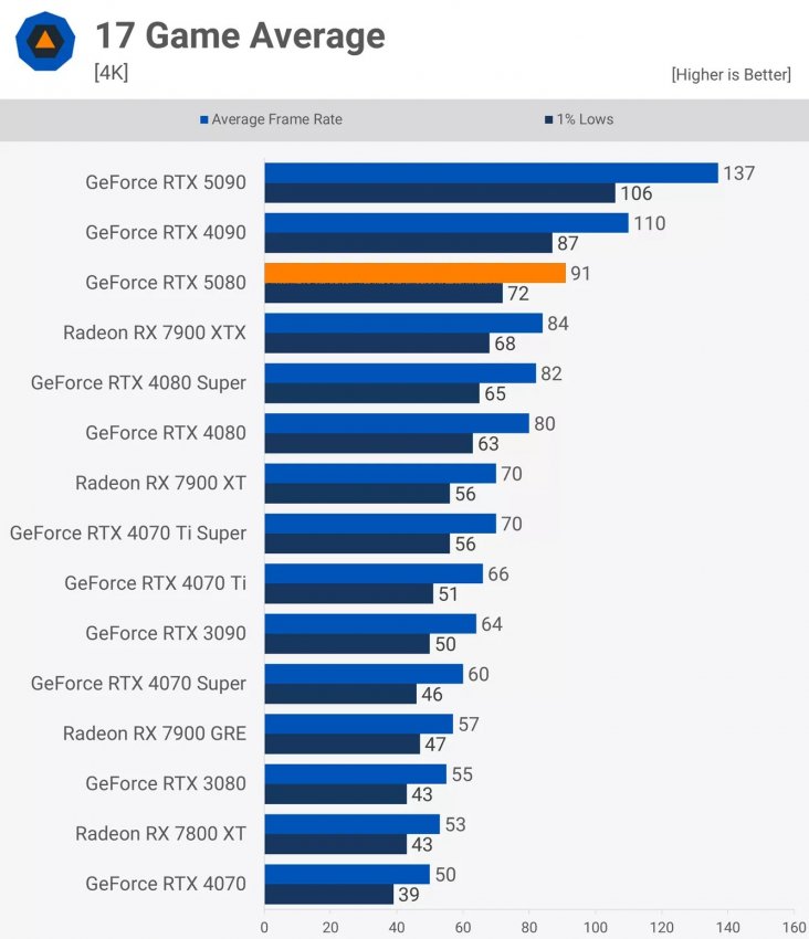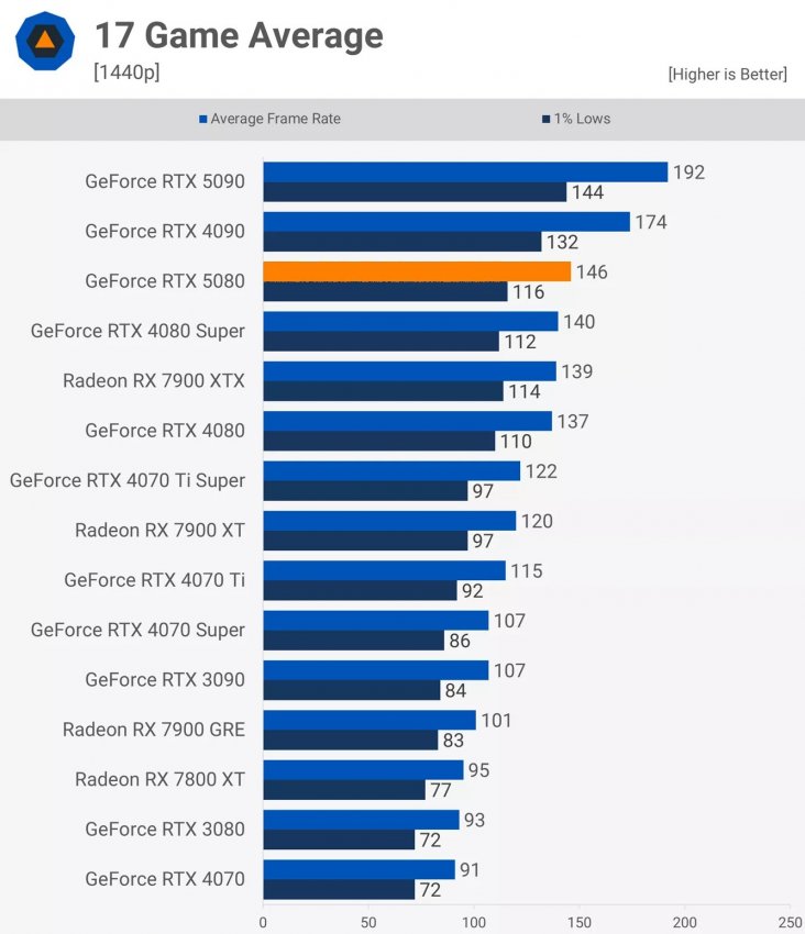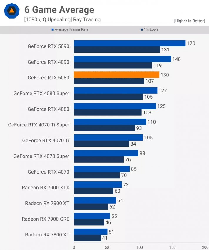 Тесты TechSpot показали, что новая GeForce RTX 5080 обеспечивает практически тот же уровень производительности, что и RTX 4080 Super. При традиционном рендеринге, без трассировки лучей, в разрешении Full HD (1920 × 1080) новинка и вовсе уступила предшественнице, тогда как в 1440p (2560 × 1440) и 4K (3840 × 2160) опередила её на 5–10 % в среднем. С трассировкой лучей ситуация изменилась незначительно, но в Full HD отставания уже нет. Игровые тесты в 1440p