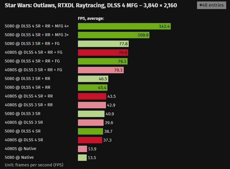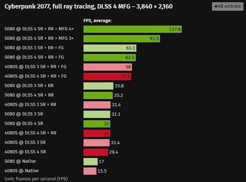 С генерацией множества кадров видеокарта заметно вырывается вперёд относительно RTX 4080 Super. В зависимости от сценария и игры новинка может обеспечить от двух до почти четырёхкратного прироста частоты кадров по сравнению с GeForce RTX 4080 Super. Обозреватели отмечают, что включение генерации кадров повышает задержку, но незначительно — примерно на 10 %. Динамичные игры, как отмечает ComputerBase, выигрывают от DLSS 4 MFG: на мониторе с высокой частотой обновления игра выглядит намного плавнее, чем при обычной генерации кадров. Однако в целом «настоящий» рендеринг без генерации с визуальной точки зрения выглядит лучше.