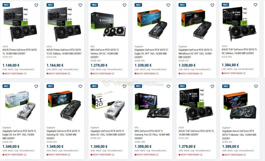 Для рынка Германии рекомендованная цена GeForce RTX 5070 Ti составляет €879. VideoCardz собрал данные крупного местного ретейлера Caseking. Предложений по рекомендованной Nvidia цене у магазина нет. Стоимость ускорителя в зависимости от производителя варьируется от €1149 до €1399.