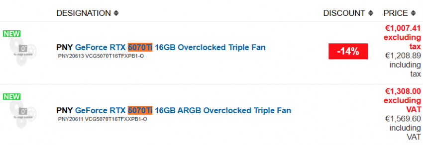 Рекомендованная цена карты во Франции составляет €884. В ассортименте обнаружены две версии от PNY. Обе по цене выше рекомендованной. Одна из них не имеет ARGB-подсветки. За дополнительные лампочки придётся доплатить €361, что выглядит абсурдным.