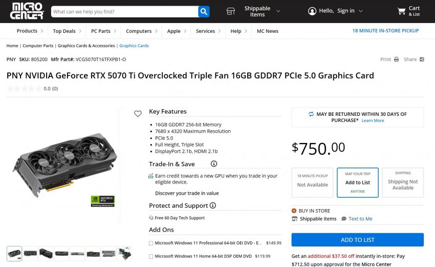 В США рекомендованная стоимость карты составляет $749. В ассортименте магазинов Newegg, B&H Photo и BestBuy карты значатся, но без указания цен. VideoCardz удалось найти одну версию RTX 5070 Ti по рекомендованной цене только у ретейлера MicroCenter. И это, судя по всему, пока единственная модель с дополнительным разгоном по рекомендованной цене.