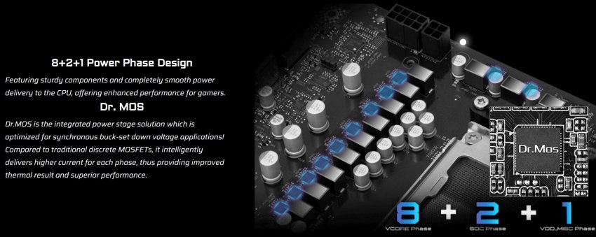 За обработку звука у платы отвечает кодек Realtek ALC897 с технологией Nahimic Audio. Набор портов включает: один HDMI, один DisplayPort, четыре SATA III, два USB 3.2 Gen2 Type-C (спереди и сзади), один USB 3.2 Gen2 Type-A, шесть USB 3.2 Gen1 (два сзади, четыре спереди) и восемь USB 2.0 (по четыре спереди и сзади).