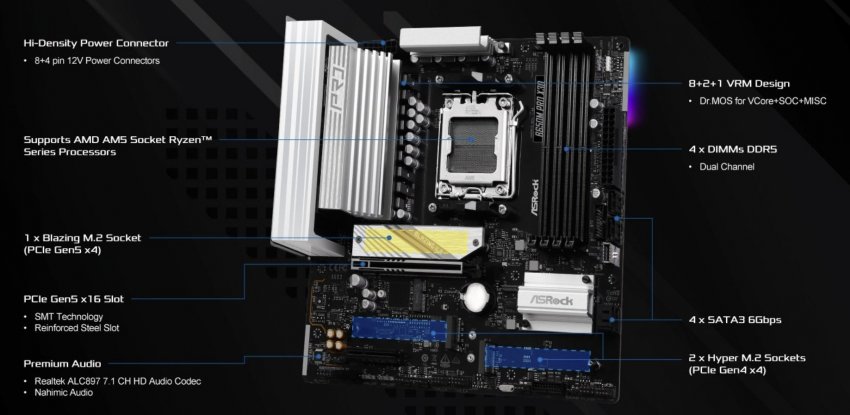 В составе B650M PRO X3D используется 11-фазная подсистема питания со схемой фаз 8+2+1. Плата получила четыре разъёма для памяти DDR5 с поддержкой модулей со скоростью до 8000 МТ/с (в разгоне). Она также оснащена полноценным интерфейсом PCIe 5.0 x16, а также одним PCIe 5.0 x4 и двумя PCIe 4.0 x4. Новинка оснащена 2,5-гигабитным LAN. WiFi-версия платы предлагает поддержку Wi-Fi 6E и Bluetooth.