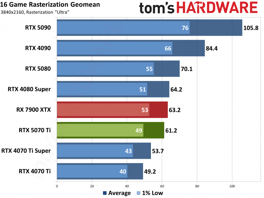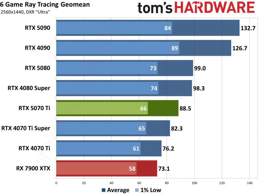 Согласно данным TechPowerUp, увеличение объёма доступной памяти, а также наличие большего количества RT-ядер в составе графического процессора RTX 5070 Ti обеспечивают карте до 49 % прироста производительности в трассировке лучей по сравнению с RTX 4070 Ti. Выводы других обозревателей в целом подтверждают это. В 4K с трассировкой лучей карта немного уступает RTX 4080 Super.