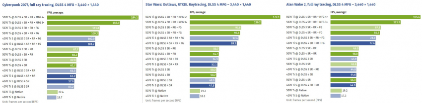 Первые независимые обзоры показали, что GeForce RTX 5070 Ti обеспечивает уровень производительности, близкий к GeForce RTX 4080 Super, но при этом предлагает поддержку мультикадрового генератора (MFG). Эта технология с помощью ИИ может генерировать до трёх дополнительных кадров на каждый отрисованный кадр и является эксклюзивной для всей серии GeForce RTX 5000. Видеокарты серии GeForce RTX 40 поддерживают генерацию лишь одного дополнительного кадра. MFG значительно повышает FPS, но его работа зависит от разработчиков игр — поддержка технологии требует интеграции непосредственно в саму игру.
