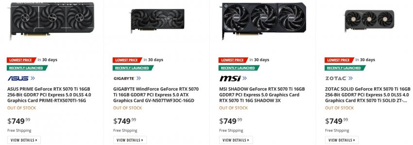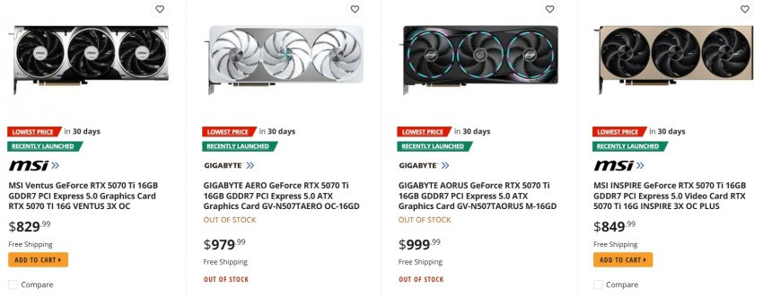 Поставщики видеокарт не спешат продавать новинку по рекомендованной Nvidia цене. Большинство моделей RTX 5070 Ti предлагаются с заводским разгоном GPU, а их стоимость превышает $800–900. На момент публикации варианты по высокой цене ещё оставались в наличии в американских магазинах.