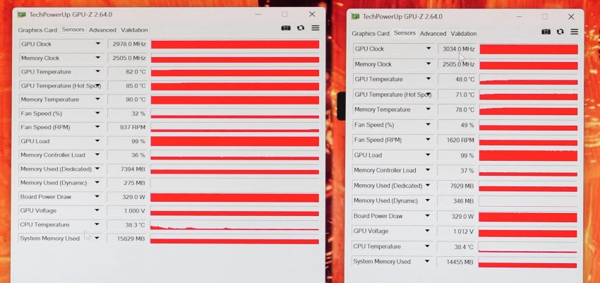 Radeon RX 9070 XT с базовыми настройками (слева) и с изменённым профилем работы вентиляторов (справа). Источник изображения: Der8auer