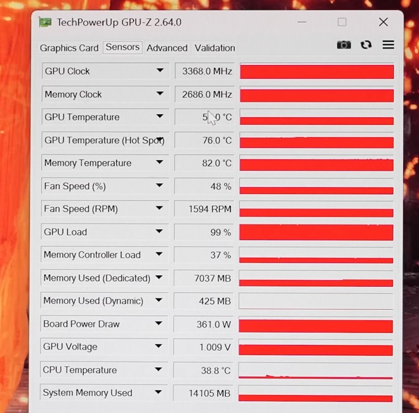Сначала Роман изменил профиль работы вентиляторов, выставив максимальное значение на 49 %. Это сразу сказалось на повышении максимальной частоты GPU, который смог автоматически разогнаться до 3030 МГц. Однако скорость чипа не достигла заявленного PowerColor значения 3060 МГц для этой модели.