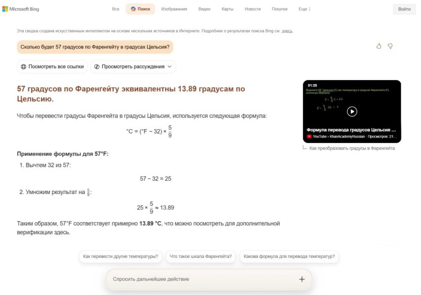 Copilot Search поддерживает естественный язык, поэтому пользователю не нужно беспокоиться о правильности составления поискового запроса. Например, если спросить: «Сколько будет 57 градусов по Фаренгейту в градусах Цельсия?», Copilot Search поймёт, что требуется преобразование температуры из одной шкалы в другую. Поисковик предоставит не только ответ, но и пояснение, как выполняется преобразование.