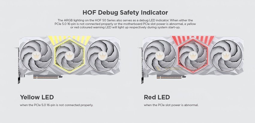 Примечательной особенностью новинок стала система HOF Debug Safety Indicator, которая отображает состояние видеокарты при запуске ПК. Жёлтая и красная подсветка информируют пользователя о проблемах с питанием видеокарты, таких как неправильная установка кабеля питания или проблемы с питанием, подаваемым через слот PCIe материнской платы.
