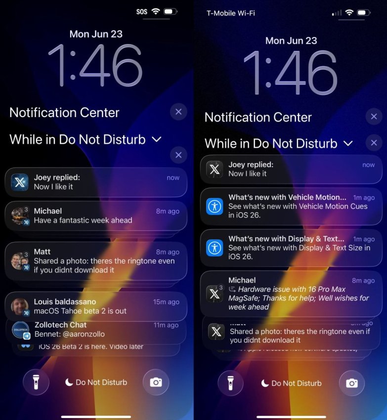 Уведомления в первой бета-версии также подверглись критике по той же причине. В новой версии Apple сделала текст более контрастным, улучшив читаемость. Однако уведомления всё ещё требуют доработки, особенно в условиях яркого или светлого фона.