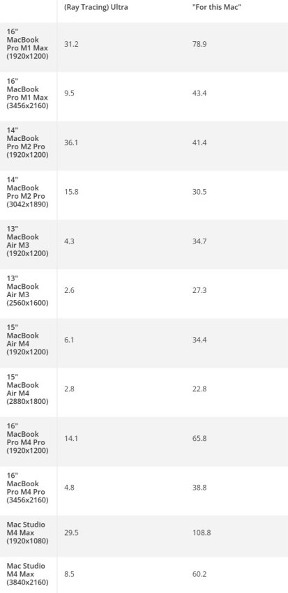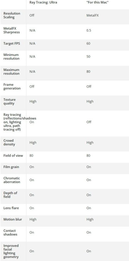 Отметим, что на более старом MacBook Pro M1 Max игра работает лучше, чем на новом MacBook Pro M4 Pro. Причина этого в том, что компьютеры Mac с чипами M1 и M2 не поддерживают трассировку лучей, а без неё игра значительно менее требовательна. Это означает, что пользователи, у которых есть новые компьютеры Mac с чипами M3 и M4, могут отключить трассировку лучей, чтобы существенно повысить кадровую частоту.