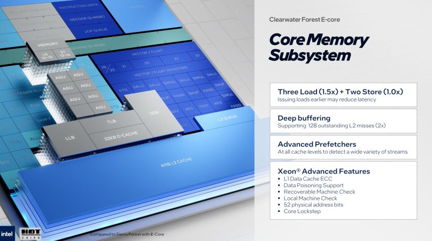 Clearwater Forest предложат до 288 вычислительных ядер и предназначены как для конфигураций с одним процессорным разъёмом, так и с двумя. Во втором случае системы обеспечат совокупно до 576 вычислительных ядер и 1152 Мбайт объединённого кэша последнего уровня.