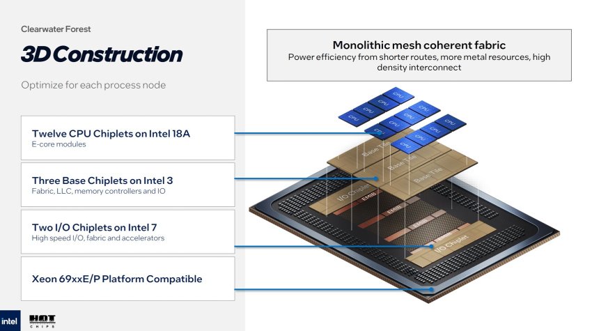 Физическая конструкция процессоров Clearwater Forest также впечатляет. В максимальной конфигурации они используют 12 вычислительных чиплетов на техпроцессе Intel 18A, размещённых над тремя базовыми чипами на базе техпроцесса Intel 3, а также два чипа ввода-вывода на базе Intel 7, расположенные по краям.