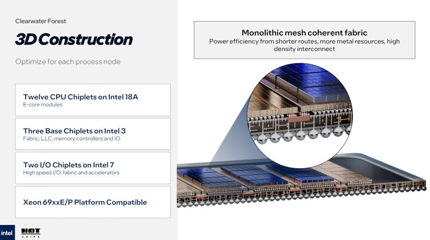 Компания объединила в Clearwater Forest значительные архитектурные усовершенствования с новейшим техпроцессом 18A и улучшенной 3D-упаковкой Foveros в сочетании с межкристальными соединениями EMIB. Новые процессоры придут на смену серии Sierra Forest и построены вокруг энергоэффективных ядер Darkmont.