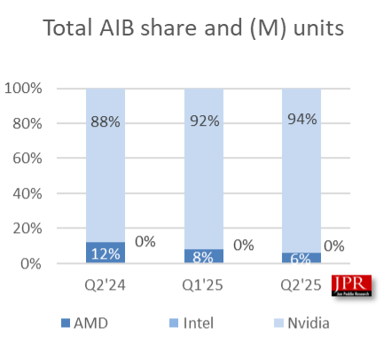 Сделано это было, как легко догадаться, в ущерб AMD, чьи позиции на рынке дискретных видеокарт последовательно сократились с 8 до 6 %. Компания Intel на этом рынке присутствует чисто условно, поскольку авторы исследования в лице специалистов Jon Peddie Research её долю оценивают в 0 %. Напомним, что лишь с учётом интегрированной графики, Intel пока может спокойной считаться лидером рынка компьютерных GPU.