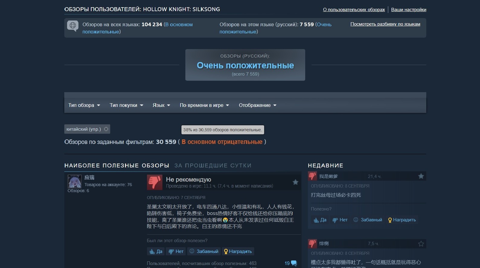 Как подметили в издании Eurogamer, из более чем 30 тысяч отзывов о Hollow Knight: Silksong в Steam на упрощённом китайском языке лишь 38 % являются положительными («в основном отрицательные» обзоры).