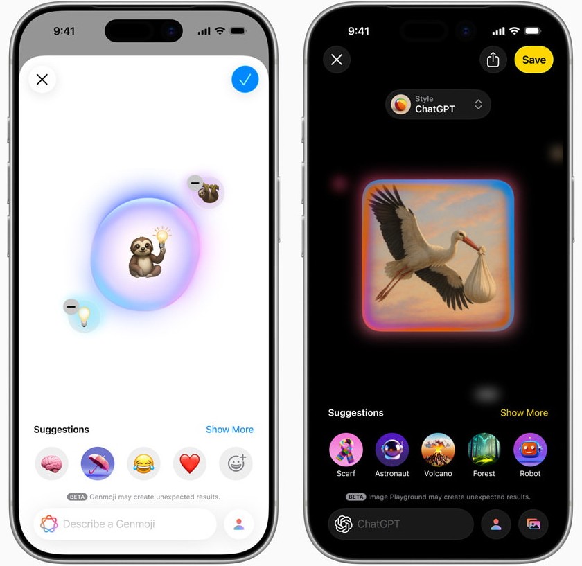 Эмодзи Genmoji, функция, основанная на генеративном ИИ, позволяет комбинировать эмодзи с текстовыми описаниями или настраивать персонажей, созданных на основе фотографий людей из библиотеки «Фото». Image Playground предлагает аналогичные возможности для создания визуальных эффектов и напрямую интегрируется с «Сообщениями».