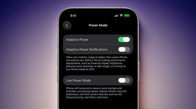 В iOS 26 появился режим адаптивного питания (Adaptive Power Mode), наряду с существующим режимом энергосбережения. Apple заявляет, что этот режим может при необходимости «регулировать производительность», чтобы продлить время автономной работы iPhone, в том числе немного снижая яркость дисплея и позволяя некоторым процессам «занимать больше времени». Адаптивный режим также автоматически включает энергосбережение, когда оставшийся заряд аккумулятора iPhone достигает отметки 20 %.