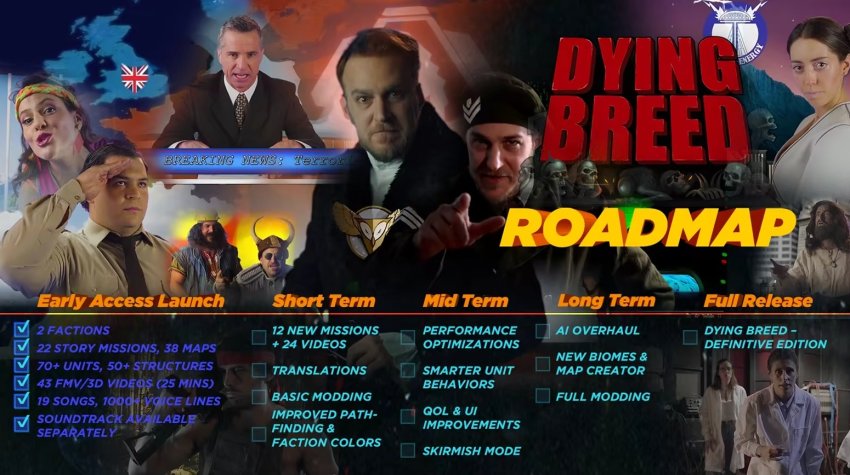 На старте раннего доступа Dying Breed предлагает две уникальные фракции, 22 сюжетные миссии, заставочные ролики с живыми актёрами и олдскульную графику в духе игр Westwood Studios (серия Command & Conquer).