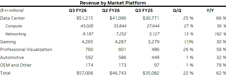 Игровой сегмент показал рост выручки на 30 % в годовом сравнении до $4,3 млрд (всего 7,5 % от всей выручки), но последовательно она снизилась на 1 %. Такая коррекция, по словам финансового директора Nvidia, обусловлена выходом складских запасов на более близкий к норме уровень в ожидании сезона предпраздничных распродаж. В годовом сравнении игровая выручка выросла преимущественно за счёт высокой популярности семейства Blackwell.