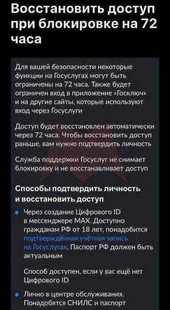 Далее приложение сообщает, что ограничения будут автоматически сняты через 72 часа, а чтобы восстановить доступ раньше, необходимо подтвердить личность. Предлагается всего два способа сделать это: либо лично обратиться в центр обслуживания в МФЦ, либо создать «Цифровой ID» в мессенджере Max.