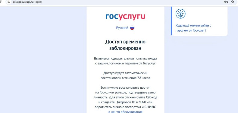 В настольной версии некоторые пользователи и вовсе столкнулись с полной блокировкой на 72 часа, сопровождаемой следующим сообщением: «Доступ временно заблокирован. Выполнена подозрительная попытка входа с вашим логином и паролем от „Госуслуг“». Далее отмечается, что для восстановления доступа раньше, чем через 72 часа, необходимо отсканировать QR-код и создать «Цифровой ID» в Max либо обратиться в МФЦ.