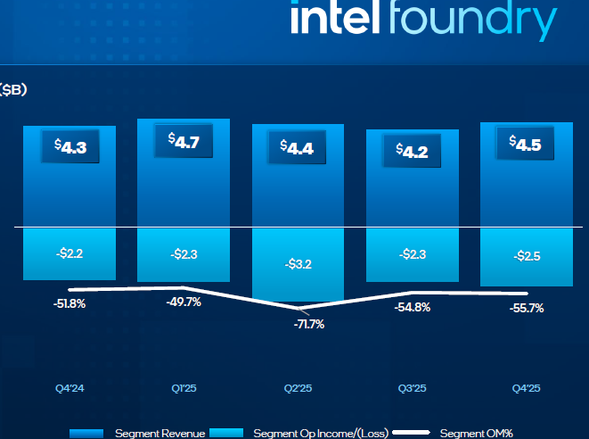 Компания особо подчёркивает, что последовательный рост выручки на контрактном направлении на 6,4 % был обусловлен ростом доли кремниевых пластин, обрабатываемых с использованием EUV-литографии. Эта доля выросла с менее чем 1 % в 2023 году до более чем 10 % в 2025 году. Выручка Intel Foundry от внешних клиентов в четвёртом квартале выросла до $222 млн, но в значительной мере это определялось реструктуризацией, связанной с обособлением Altera. В текущем квартале выручка Intel на контрактном направлении должна последовательно вырасти на двузначное количество процентов.