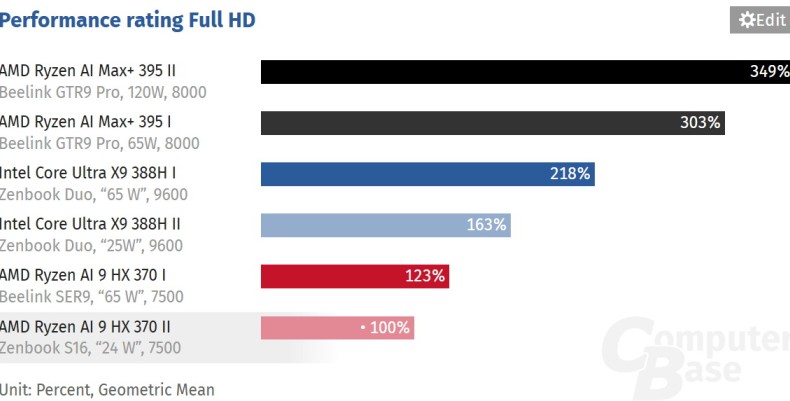 Портал Computer Base протестировал Core Ultra X9 388H со «встройкой» Arc B390 на ноутбуке с памятью LPDDR5X-9600. По среднему показателю в играх в разрешении Full HD графика Arc B390 оказалась быстрее Radeon 890M со значительным отрывом как в режиме энергопотребления 25 Вт, так и при более высоких значениях выставленного TDP. Портал также отметил незначительные изменения в производительности при работе ноутбука от внутренней батареи и от розетки. В целом Arc B390 оказалась до 63 % быстрее в режиме 25 Вт, чем Radeon 890M в режимах 24/25 Вт и даже 65 Вт в составе AMD Ryzen AI 9 HX 370.