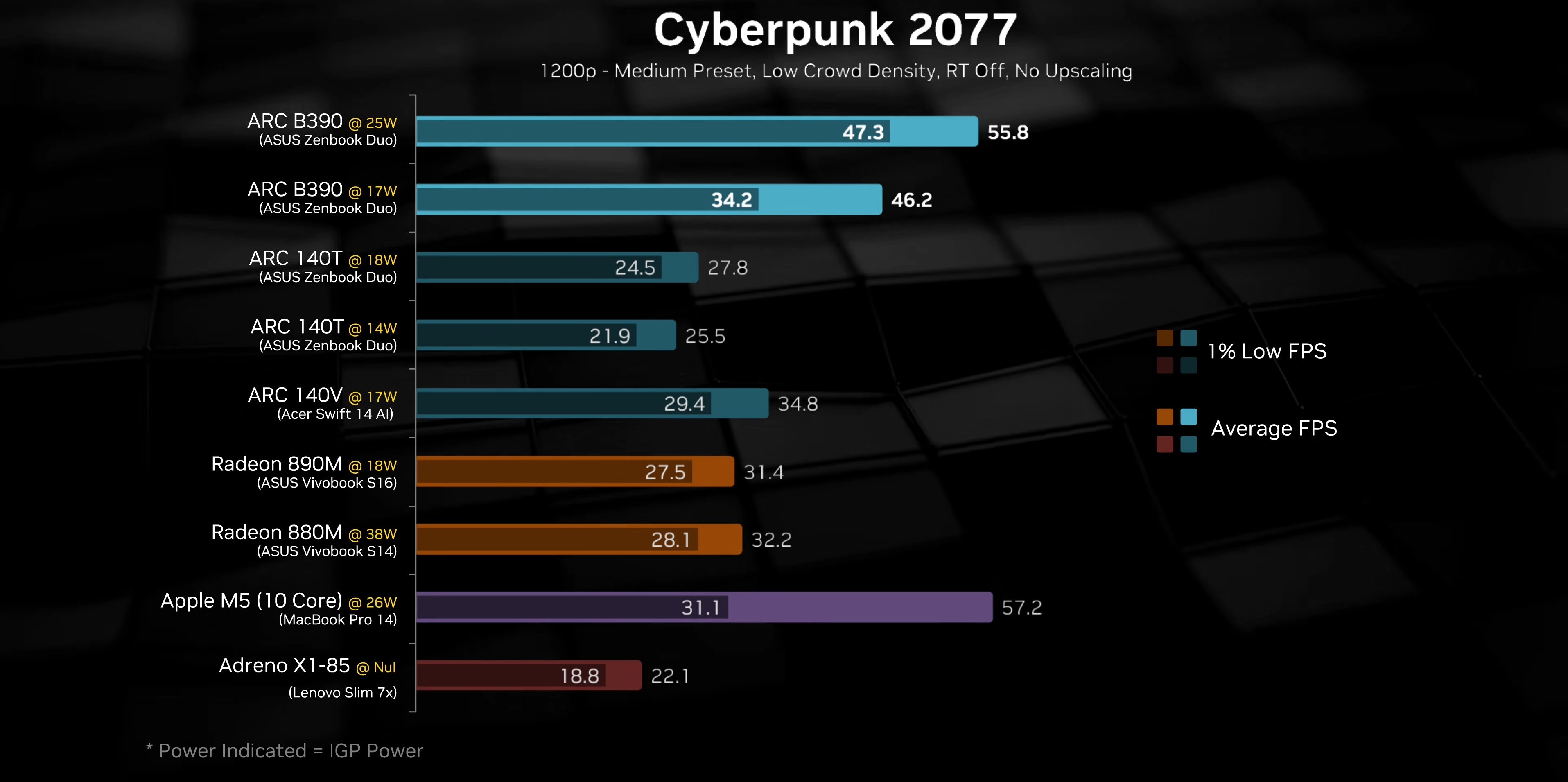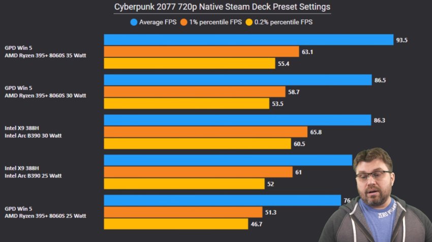 Блогер Phawx акцентировал в своих тестах внимание на режимах ограничения мощности (энергопотребления) процессора, что критически важно для портативных игровых устройств. Он провёл тесты «встройки» Intel Arc B390 в режимах энергопотребления от 10 до 35 Вт. При одинаковом энергопотреблении Arc B390 превзошла результаты iGPU в составе Ryzen AI 9 HX 370 в нескольких играх, включая проекты с низкими настройками, и предсказуемо увеличивала разрыв при энергопотреблении выше 20 Вт.