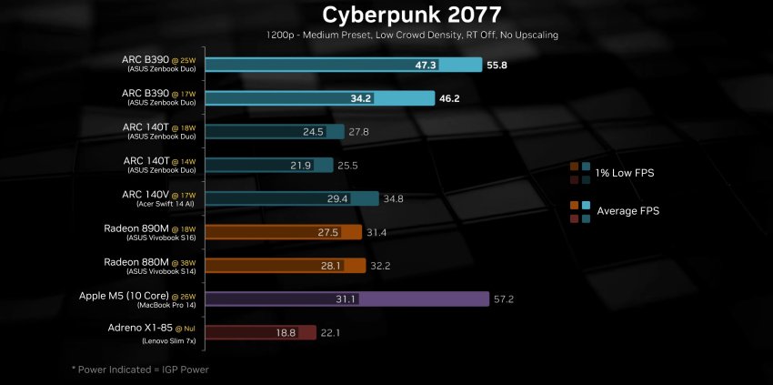 Участвовавшая во многих обзорах модель ноутбука Asus Zenbook Duo с Core Ultra X9 388H не оснащена дискретной графикой, а значит, тесты обозреватели проводили на встроенной. Результаты показали, что новая графика Intel превосходит по производительности встроенную графику AMD Radeon 890M в составе Ryzen AI 300 при том же энергопотреблении. Более того, в некоторых случаях она достигает уровня производительности мобильной GeForce RTX 4050.